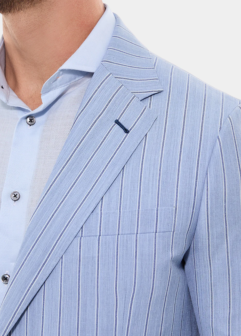 Blazer Raya Diplomática Azul Maya Y Azul Zafiro de HAVOC es la expresión máxima de elegancia y estilo para el hombre moderno. Confeccionado con materiales de la más alta calidad, este traje ofrece una textura suave, una caída impecable y un ajuste diseñado exclusivamente para realzar tu figura y destacar tu porte.