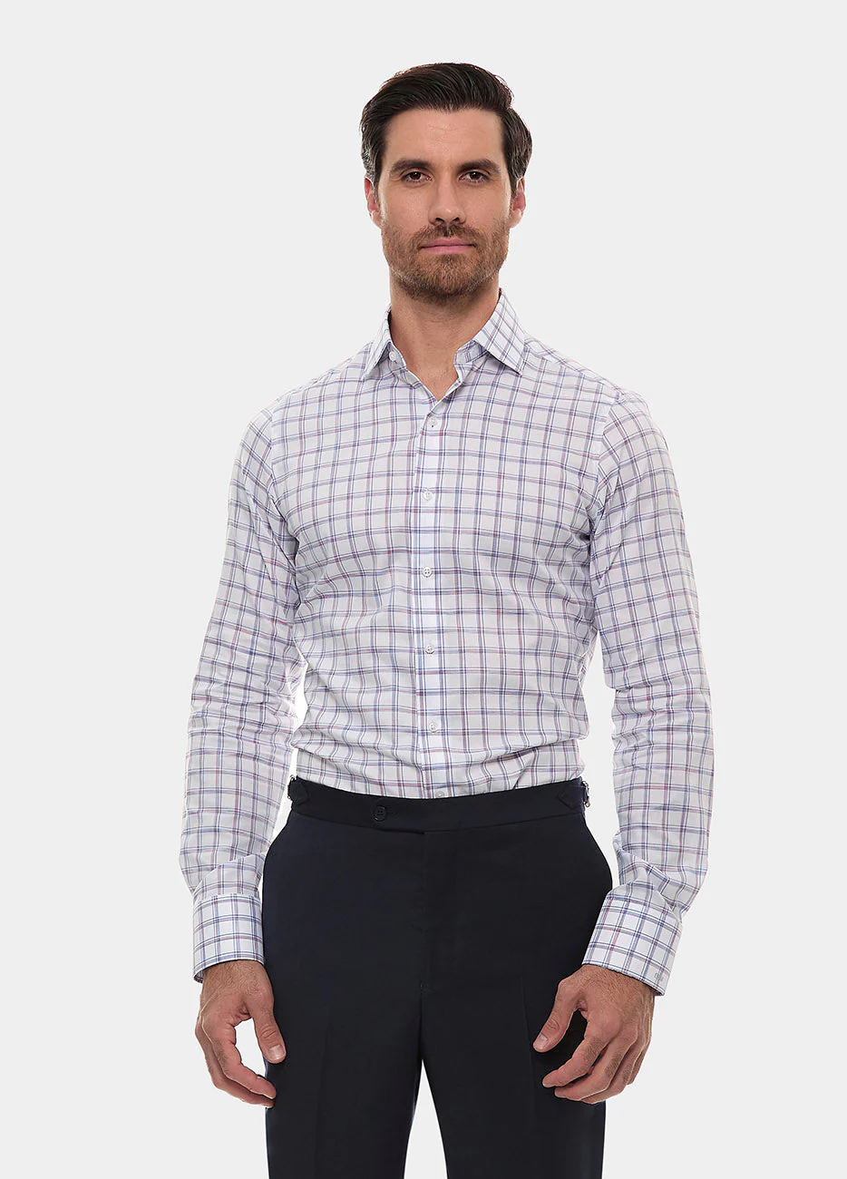 Camisa Cuadro Ventana Blanco Linea Azul Y Vino Diseñado y Confeccionado a tu Medida Descubre la sofisticación de HAVOC, una prenda que encarna el arte sartorial en cada detalle. Ofrece una textura suave y una caída impecable que te acompañará con elegancia en cualquier ocasión. Su exclusivo tejido aporta un toque de distinción que nunca pasa desapercibido, ideal para el hombre que busca un estilo único y refinado.