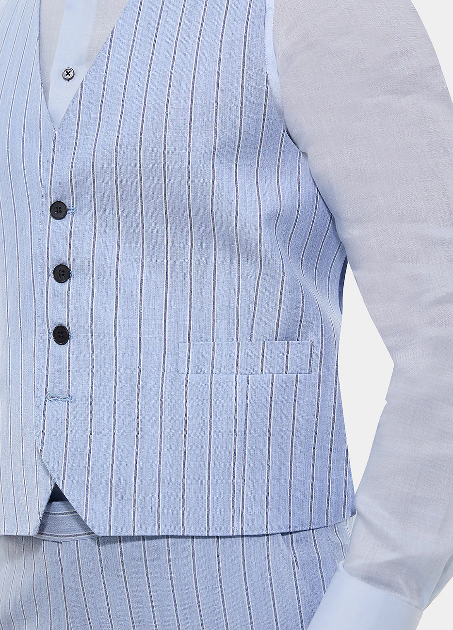 Chaleco Raya Diplomatica Azul Maya Y Azul Zafiro Diseñado y Confeccionado a tu Medida Descubre la sofisticación de HAVOC, una prenda que encarna el arte sartorial en cada detalle. Ofrece una textura suave y una caída impecable que te acompañará con elegancia en cualquier ocasión. Su exclusivo tejido aporta un toque de distinción que nunca pasa desapercibido, ideal para el hombre que busca un estilo único y refinado.